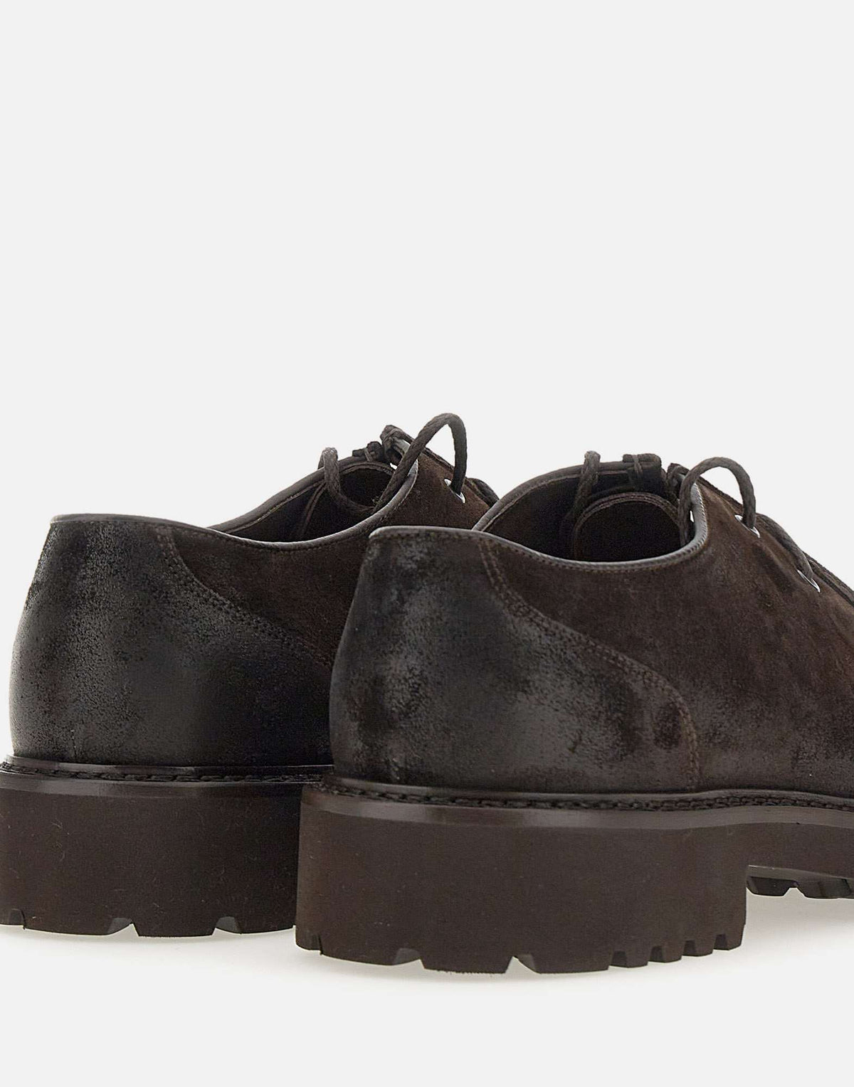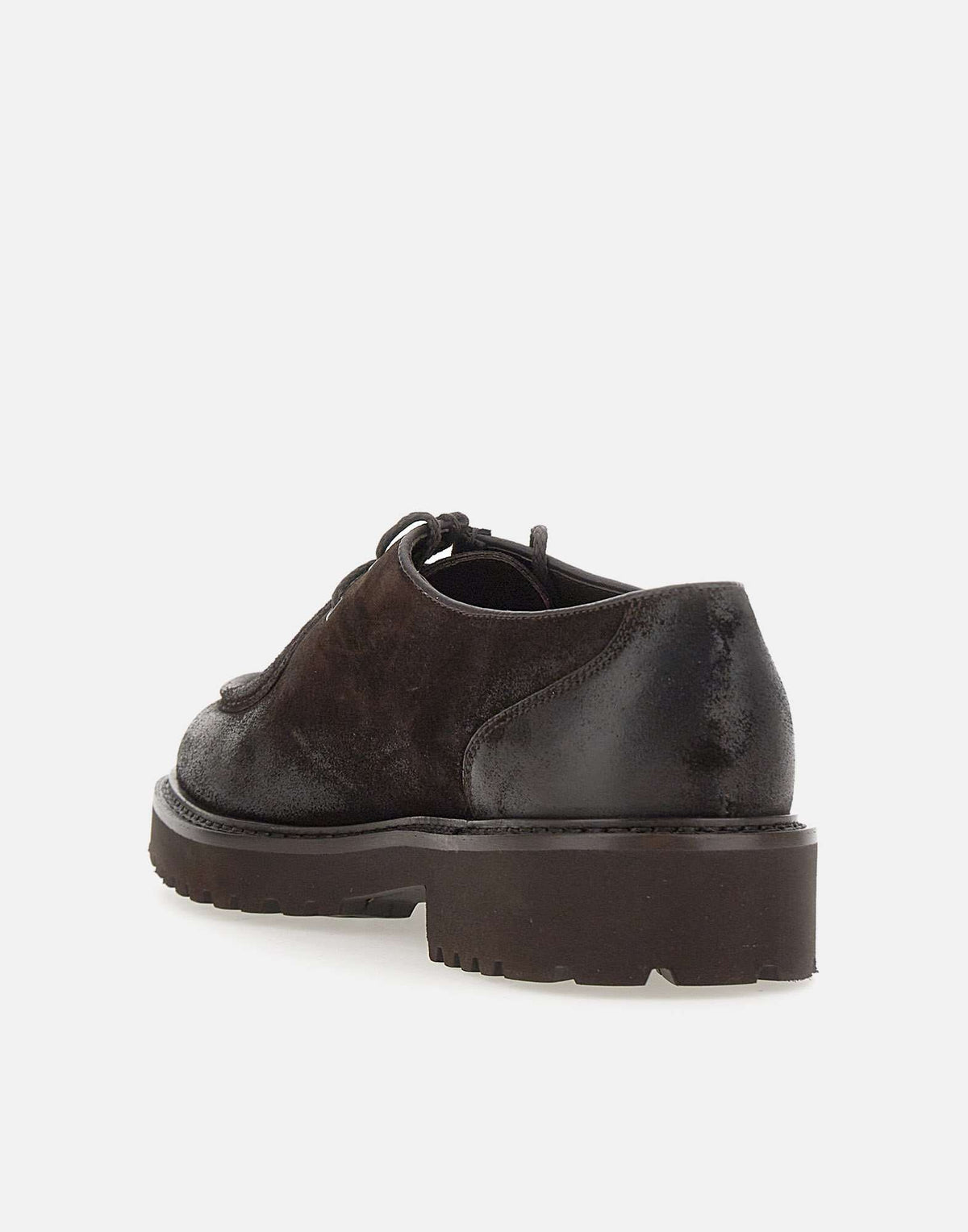 Doucal's "Commander" men's suede lace-up, dark brown, vintage treatment, matching laces, visible stitching, round toe, logoed insole, lug rubber sole, 4cm high heel